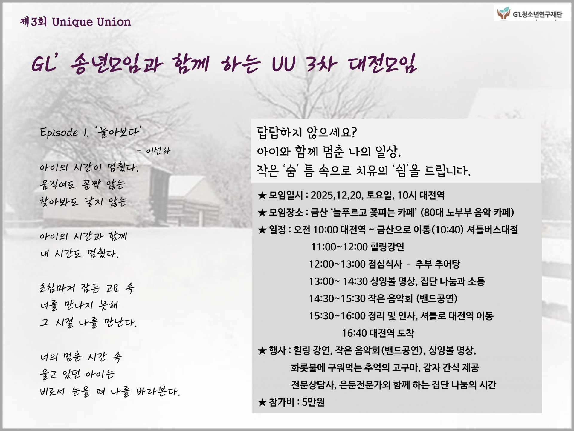2025년 마지막 UU모임(3차)을 GL' 부모님 송년모임과 함께 되어 영광입니다. 스산한 바람에 웅크린 채 겨울을 보내시지 마시고, 지엘 송년모임에 참여하셔서 UU가 준비한 '힐링의 시간'으로 에너지 가득 채우시길 권해 드립니다.