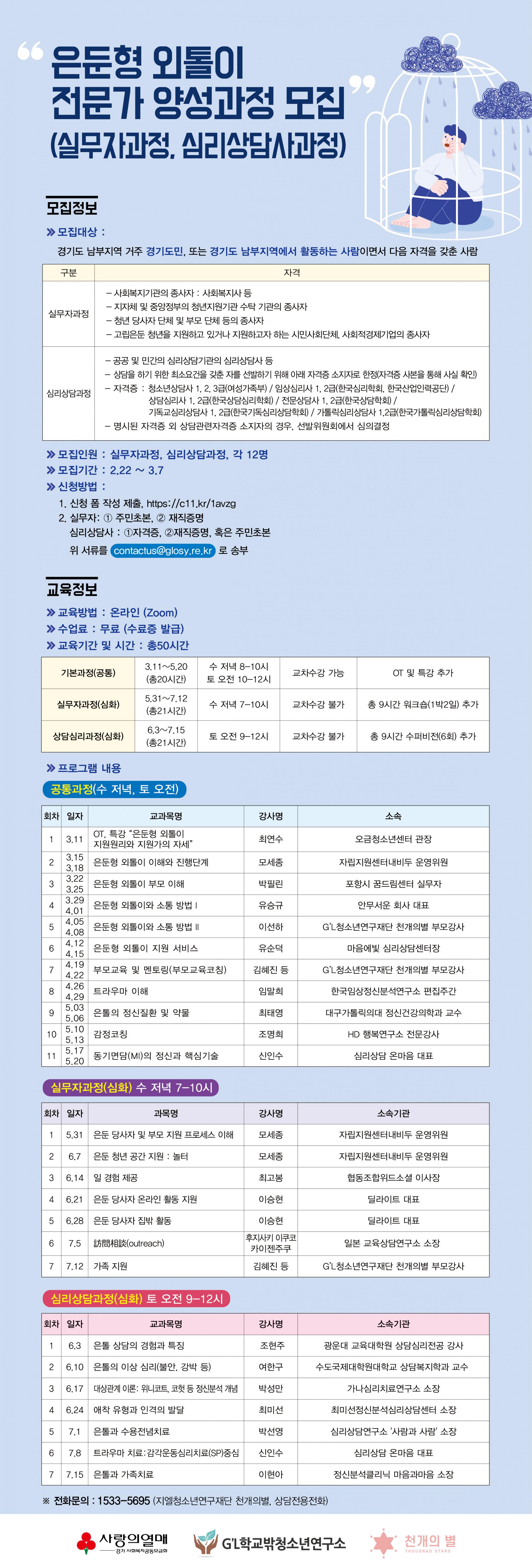 은둔형 외톨이에 특화된 전문가를 양성하기 위한 프로그램을 마련했습니다. 은둔형 외톨이의 특성을 이해하고 이들에게 맞는 사업기획과 진행을 촉진하기 위한 전문지원가, 은둔형외톨이에 맞는 다양한 상담모델을 시도하기 위해 전문심리상담사를 양성하고자 합니다. 경기남부 지역에 거주하고 있거나 이 지역에서 활동하고 있는 사람이 우선 대상이며 포스터에 명시된 자격이 필요합니다.