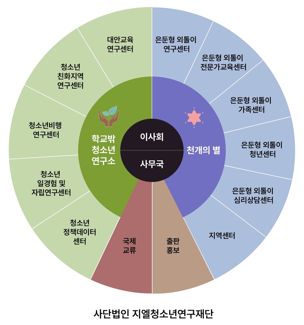 은둔형외톨이 연구센터, 가족과 청년에게 교육/멘토링/활동을 지원하는 가족센터, 청년센터가 있으며 은둔형외톨이 전문인력 양성을 목적으로 하는 전문가교육센터, 가족과 청년에게 심리상담을 지원하는 심리상담센터가 있습니다. 또한 지엘(G'L)을 통해 성장한 부모멘토를 축으로 6개 지역센터가 설치되어 있습니다.